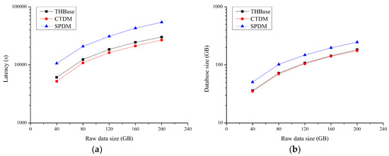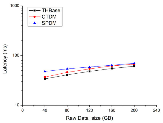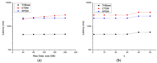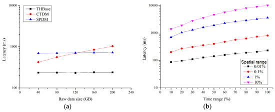 Subsequently, we tested the spatiotemporal range query. Firstly, we randomly selected 100 spatiotemporal ranges as the query conditions when the amount of dataset are increased from 40 GB to 200 GB. The spatial range is 1%, and the time range is 24 h, the results of average latency are shown in Figure 6a. It can be seen that as the dataset size increases, the response time of CTDM increases gradually, while THBase and SPDM do not change much. This is because CTDM can only perform pruning and query based on MO, namely, it is impossible to use time conditions to exclude irrelevant trajectory data before querying HBase, and the filter overhead after accessing HBase increases with the increase of dataset. While THBase and SPDM can process pruning and query according to time condition, so the query is less affected when dataset increases and the query time range is unchanged. Among the three schemes, THBase has the highest query performance due to the following reasons: (1) all the index entries and trajectory data of the same MO coreside on same node, so the data transmission overhead in the HBase cluster can be avoided; (2) the distributed indexing scheme can better utilize the parallelism of cluster compared to the centralized index; (3) the orderly data organization for index entries and trajectory points effectively reduces the computing overhead for sorting; (4) the segment-based storage model and index model have a higher pruning precision.