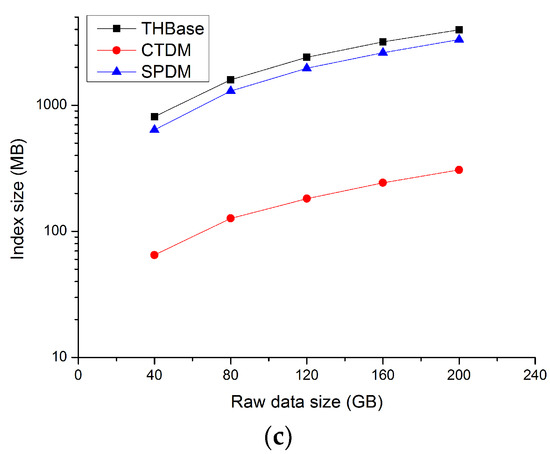 Figure 4b,c show the data and index footprint of different schemes. In the aspect of storing data, CTDM has the lowest storage cost due to the MO-based data model, while THBase which has the segment-based data model consumes the larger footprint. SPDM needs to insert data into one data cell multiple times, resulting in multiple versions, so SPDM takes up the most cost. Also, in the aspect of index, the G-IT index of CTDM takes up the least cost due to its MO-based data granularity and relatively simple index entry structure. The footprint of index in THBase is larger than that in CTDM, but it only requires about 2.0% of actual storage, so the index of THBase can be completely stored in memory.
