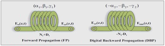 DBP—As the name suggests, this is a DSP method that attempts to re-wind the non-linear channel. In this method, the optical channel is rigorously numerically modelled and the received signals are digitally back-propagated through a modelled ‘virtual’ channel with the help of the split-step Fourier (SSF) method as shown in Figure 1 []. In Figure 1, the α, β, and γ terms refer to the loss, 2nd order CD and fiber non-linearity, respectively. In this way, part of the non-linearity can be cancelled. However, the problem associated with this method is that the channel cannot be modelled very accurately due to random parameters during transmission such as random polarization mode dispersion (PMD) and the interaction between amplified spontaneous emission (ASE) noise from optical amplification with fiber non-linearity (also known as parametric noise amplification), which can only be statistically characterized. Additionally, it demonstrates impractically high complexity for real-time applications since a huge number of computation steps are needed to undo the non-linear interactions. For the latter, it has been shown in [,] that a minimum 40 steps/span is required to eliminate non-linear distortions (also called as FS-DBP). It worth mentioning that DBP has been recently modified to account for PMD [] and a stochastic-DBP was also designed to partly account for the ASE noise from optical amplification []. In [], however, a maximum a posteriori principle was introduced with the help of Bayesian graphical models (a machine learning based approach) being combined with the deterministic DBP.