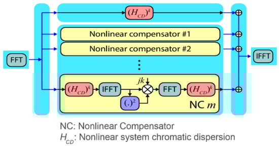 Inverse-Volterra series-transfer function (IVSTF) block diagram for coherent optical orthogonal frequency division multiplexing (CO-OFDM). Where m is the number of spans in a long-haul network and k is the Kernel order []. (I)FFT: (Inverse) fast Fourier transform.