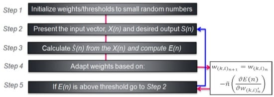 An ANN-NLE based on the multilayer perceptron (MLP) has been implemented in []. MLP-ANNs form a complex map with non-linear decision boundaries between input and output spaces, helping in inverting the effects of non-linear distortion. ANN is an emerging technology applied in contemporary wireless communications for the reduction of OFDM-based non-linear distortion in power amplifiers. ANN schematic diagram for m-QAM CO-OFDM is shown in Figure 3b, which is placed directly after the fast Fourier transform (FFT) at the digital part of the CO-OFDM receiver (see Figure 3a). In summary, it comprises of p sub-neural networks considering a single hidden-layer. Each sub-network is being associated to each subcarrier k, and where s(k) is the training vector. The received symbols, i, for each subcarrier x{k} are processed by the ANN neurons which are subsequently multiplied with a weight value, wk,i, for each subcarrier where the outputs of all subcarriers are summed. In the training stage, the minimum mean-square error (MMSE) algorithm determines the error signal and updates the weights, which are iteratively updated until the desired error value is reached, thus indicating the optimal match between the sub-network output and the transmitted CO-OFDM symbols. The error signal is given as where ŝ(k) is calculated in terms of a non-linear activation function (NAF), φk,i, that is given by . The chosen NAF is a differential sigmoid function and is a “split” complex NAF, where two conventional real-valued functions process the I-Q components in contrast to our proposed approach which processes the complex data simultaneously, thus accounting for real and imaginary data cross-information. The number of ANN neurons in every sub-neural network is equal to the number of points of the constellation. The 2D ANN is based on the Riedmiller’s resilient-back propagation (RR-BP) algorithm and performs an approximation to the global minimization achieved by the steepest descent []. The training function updates the weights and bias values according to RR-BP, which minimizes the difference between the ANN output and the desired output by splitting the complex OFDM data in two real-valued data collections. The transfer functions for the hidden layer of the ANN are differentiable and similar to the hyperbolic tangent function. For the output layer, the linear function “purelin” was employed []. The MMSE in Figure 3a represents the subsystem that implements RR-BP to find the weights that minimize the error vector , where and are the desired and calculated output vectors, respectively. The weights are updated according to the steps described in Figure 4 by applying the gradient descent on the cost function E(n) to reach a minimum. Finally, at the end-output of Figure 3b we introduced slack variables that allow some misclassified symbols but penalizes them.