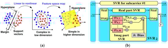 The SVM is placed in the same NLE block as in Figure 3a. In Figure 5b the supervised support vector regressor (SVR)-NLE is shown [,], which in contrast to other versions such as in [] that only classifies the data (i.e., support vector classifier, SVC), SVR is considered more advanced as it performs both classification and regression and for simplicity is called SVR. It is comprised of k hidden nodes (support vectors), with each node being associated to each subcarrier k. The procedure of SVR is similar to [,]. In summary, the received symbols for each subcarrier x{k} are processed by the NLE supported vectors which are scaled by weight values (Lagrange multipliers) for each subcarrier wk,i, after which, the outputs for different k are summed. The distribution of noisy constellation points is learnt during an initial training process similarly to ANN. Once the distribution is learnt, the detector can make decision for the new unknown observation symbols. A hyperplane is also obtained through approximation of a nonlinear function using a set of Kernels (sigmoid function) of training dataset. SVR maps the data to a high-dimension feature space as shown in Figure 5a, using a nonlinear mapping φ and then linear regression is formulated by introducing the “ε-insensitive” loss function in the following form where is the target linear model, denotes a set of nonlinear transformations of input x, and b is the bias term. The number of vectors in every hidden node is equal to the number of points of the constellation; hence for example for 4-QAM is 4. The “ε-insensitive” loss function can be learnt through training process by minimizing the error, where are slack variables corresponding to the upper and lower bounds on the output function and C is the penalty parameter. Depending on how much loss is ignored, the latter equation can be approximated by the Lagrange loss function .