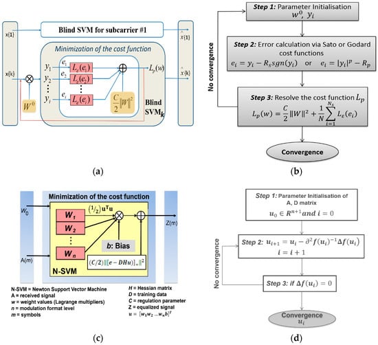 Blind support vector machines (SVMs) (BNLEs): (a) Sato/Godard SVM for CO-OFDM and (b) its iteratively minimized by re-weighted least squares (IRWLS) pseudocode [,]; (c) Newton-based SVM and (d) the algorithm’s steps [].