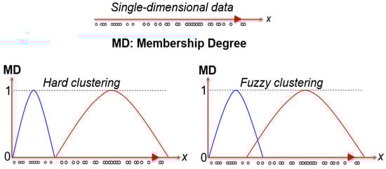 FL: This belongs to the probabilistic machine learning algorithms, and permits the symbols to fluctuate the data membership degree (MD) while being allocated into many clusters as shown in Figure 7 by minimizing the objective function: In this objective function, the terms m, L, N, and R, correspond to the “Fuzzy partition matrix exponent”, clusters, total number of subcarriers and symbols, respectively. The role of the “Fuzzy partition matrix exponent” is to adjust the grade of overlapping between clusters. Where ti is referred to the ith symbol, cj is the center of a jth cluster, and μij refers to the MD of ti into jth cluster. FL is processed in 5 steps: 1. Enter the number of targeted clusters; 2. Initiate the cluster MD, μij; 3. Estimate the center per cluster by ; 4. Update μij using and compute Fm; 5. Return and perform steps 2–4 until Fm is converged at a desired threshold.