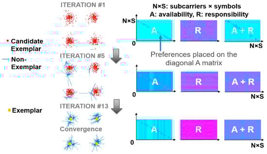 AP: Every symbol in AP is a potential exemplar by viewing each symbol as a node that recursively transmits real-valued messages (separately for amplitude and phase) along the edges of the NLE network until a good set of exemplars and corresponding clusters emerges []. ‘Messages’ are updated by simple formulas that search for minima of an appropriately chosen energy function. At any symbol in time the magnitude of each message reflects the current affinity that 1 symbol has for choosing another symbol as its exemplar. Let x1 through xn be a set of complex data (symbol), with no assumptions made about their internal structure, and let S be a function that quantifies the similarity between any 2 symbols, such that S(xi, xj)>S(xi, xk) if xi is more similar to xj than to xk. For this example, the negative squared distance of 2 symbols was used i.e., for points xi and xk,