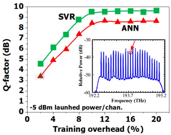 Training overhead evolution example at −5 dBm of launched optical power (LOP) per channel for supervised support vector machine-regression (SVR) and artificial neural network (ANN). Inset: received optical spectrum of wavelength-division multiplexing (WDM) CO-OFDM system [,].
