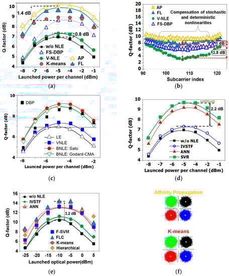 In Figure 11, the Q-factor against the LOP per channel is plotted for various machine learning and deterministic NLEs for the QPSK middle-channel in WDM CO-OFDM. It shown that AP tackles non-linearities more effective than any other algorithm under test since it compensates both the PNA and the accumulated inter-subcarrier FWM which appears random (due to the impact of a high PAPR). This is corroborated in Figure 11b, where the Q-factor for the middle subcarriers is plotted which suffers the most mainly from inter-subcarrier FWM [] (secondary from inter-subcarrier cross-phase modulation, XPM) at the optimum LOP. However, some of the inter-channel nonlinearities are also compensated better by AP, which are not as strong as the intra-channel (i.e., inter-subcarrier nonlinear distortions). In Figure 11f, the clear nonlinear decisions (soft/overlapping clustering) compared to K-means hard decisions (exclusive clustering) is also depicted for a received QPSK constellation diagram at −7 dBm of LOP. In Figure 11c–e we show the performance of unsupervised, supervised and fast machine learning algorithms, i.e., Sato/Godard-CMA BNLEs, ANN/SVR, and Fast-Newton-SVM (F-SVM), respectively. Results in Figure 11c–e conclude that AP clustering algorithm has the best performance in QPSK WDM CO-OFDM, and then SVR and FL follow. Finally, in Figure 11 it is shown that at low power a Q-factor improvement of the adopted machine learning algorithms is observed over the deterministic algorithms and linear equalization. This is due to the ability of machine learning NLEs to partially tackle the accumulated ASE noise from concatenated optical amplifiers. Such statement is strong considering the negligible noise induced from electrical components and digital-to-analogue and analogue-and-digital converters (error vector magnitude below 7% for optical back-to-back).