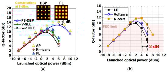 In Figure 12, results are depicted for single-channel 16-QAM CO-OFDM using the same algorithms. Similarly, AP shows the greatest performance reaching almost 15 dB in Q-factor and outperforming the FS-DBP. This means that the strong nonlinear phase noise of 16-QAM can be successfully tackled by AP, which seems to effectively compensating intra-channel deterministic and stochastic nonlinearities. However, it should be noted that all algorithms at low powers present poor performance due to the stronger PNA and ASE noise. It should be noted that an ANN was also implemented in [,], however, the bit-rate and training testing was different than SVR and so is not included here to be compared. Nevertheless, as shown in [,] the performance is anticipated to be worse than SVR and consequently and from AP.