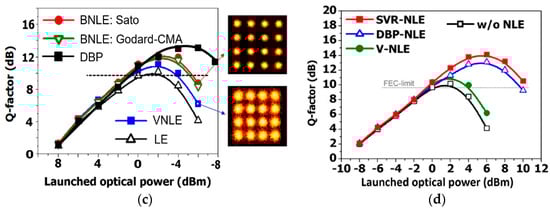 - Giacoumidis, E.; Mhatli, S.; Nguyen, T.; Le, S.T.; Aldaya, I.; McCarthy, M.E.; Ellis, A.D.; Eggleton, B.J. Comparison of DSP-based nonlinear equalizers for intra-channel nonlinearity compensation in coherent optical OFDM. Opt. Lett. 2016, 41, 2509–2512. [Google Scholar] [CrossRef] [PubMed]