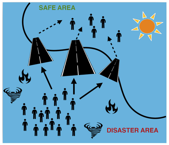 We consider a disaster area where a catastrophic event is evolving, and several evacuation routes are available within the disaster area. Let us denote their set by E = { 1 , , e , , | E | } , while each human m residing in the disaster area aims at selecting an evacuation route e to escape from the area. The set of evacuees is denoted by M = { 1 , , m , , | M | } . Each evacuation route is characterized by a specific capacity of evacuees C e , and a corresponding rate of evacuation λ e , where both depend on the physical characteristics of the evacuation route, e.g., stairs or highway. At the time that an evacuee examines to select an evacuation route, a number of humans | M | e , e E are already in the specific route e, e E . The distance of each evacuee m from the evacuation route e is denoted by d m , e . Figure 1 provides an illustrative example of the topology and model under consideration [11].