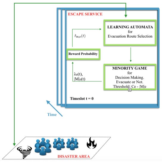 Toward realizing distributed and autonomous evacuation planning, we consider evacuees as stochastic learning automata [6]. At each operation time slot t of the reinforcement-learning loop, each evacuee m has a set of actions a m ( t ) = { 1 , , e , , | E | } in terms of selecting an evacuation route. Each action represents a different choice e of evacuation route. Toward making their decisions, evacuees consider the status of the disaster area, and specifically output set β ( t ) = { I ( t ) , S ( t ) } , where I ( t ) is the set of information characterizing the disaster area and S ( t ) = [ S 1 ( t ) , S m ( t ) , S | M | ( t ) ] is the final strategy that evacuees decide while competing among each other per each evacuation route that they want to go. The latter action is realized through a non-co-operative minority game, analyzed in detail in Section 4. Set of information I ( t ) includes evacuation rate λ e ( t ) of each evacuation route e at time slot t, which implicitly represents the normalized speed with which evacuees can move within an evacuation route, the capacity C e of each evacuation route and its number of humans | M | e ( t ) that already aim at evacuating through it. Output β ( t ) is determined from the second layer of the ESCAPE service, i.e., the minority game among evacuees.