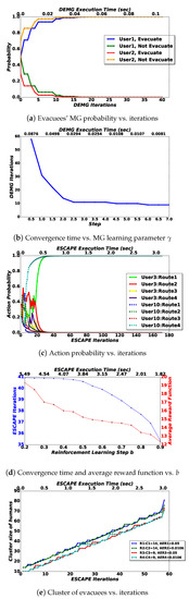 In Figure 3c we consider two distinct evacuees (User3 and User10) from the set of evacuees and evaluate their action probability vectors (updated according to Equations (2a) and (2b)), as a function of the iterations of the reinforcement-learning component. Specifically, we observed that the action probability for only one evacuation route per each evacuee increases, eventually reaching 1.0 , while the other probabilities for all remaining evacuation routes decrease until they reach a value equal to 0.0 . Such observations reconfirm that the reinforcement-learning component successfully converges to a feasible solution. In the examined scenario, we notice that User3 wants to go to Evacuation Route 1, while User10 wants to go to Evacuation Route 4. Figure 3d illustrates the necessary reinforcement-learning component iterations in order to converge (blue line) and the corresponding average reward function with respect to the number of users (red line) as a function of step-size learning parameter b of the reinforcement-learning component. It is clear that, for large values of b, convergence time as well as the average reward function decreases. This occurs because small b values enable evacuees to better explore the disaster area’s conditions and eventually make better choices regarding which evacuation route they want to follow, like, for instance, exploring evacuation routes that are not so congested as better options. Thus, in the latter case, more time is needed for the reinforcement-learning component to converge, but evacuees experience a superior reward. Considering the tradeoff between evacuees’ perceived reward and the corresponding time that the ESCAPE algorithm needs to converge, in the following, unless otherwise stated, we consider the stochastic-learning component’s step-size parameter b = 0.7 , so evacuees enjoy a relatively superior reward and, at the same time, make fast decisions.
