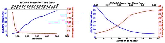 In this section, detailed scalability analysis and complexity evaluation are provided in terms of the framework performance for increasing number of evacuees and available evacuation routes. ESCAPE was tested and evaluated with an Intel(R) Core(TM) 2 Duo CPU T7500 @ 2.20 GHz laptop with 2.00 GB RAM. For demonstration purposes and without loss of generality, we considered that evacuees have mobile devices of similar computing capabilities, e.g., a commercial smartphone device. Specifically, Figure 4a presents the necessary reinforcement-learning component’s convergence iterations to PNE, the corresponding real execution time, as well as the average reward probability (discussed in Section 3), as the number of evacuees increases. We observed that the proposed ESCAPE framework scales quite well with respect to the increasing number of evacuees, presenting almost linear behavior. Moreover, it was observed that the average reward function decreases as the number of evacuees increases due to the fact that the evacuation routes become more congested and eventually evacuees tend to choose routes where the number of evacuees that are already in, i.e., | M | e , is high. Thus, based on Equation (1), the average reward function decreases. In Figure 4b, we present the behavior of the proposed framework in terms of the required reinforcement-learning algorithmic component’s iterations to converge to the PNE and of the average reward function as the number of the available evacuation routes increases. We can clearly discern that, while the number of evacuation routes increases, the number of ESCAPE iterations and also the real execution time decrease because routes are more; as a result, evacuees have the potential of exploring the disaster area more and eventually choosing evacuation routes that are not so congested. Consequently, the reinforcement-learning component needs a smaller number of iterations to reach the PNE. For exactly the same reason, the average reward function increases as the number of the available evacuation routes increases.