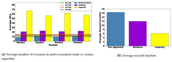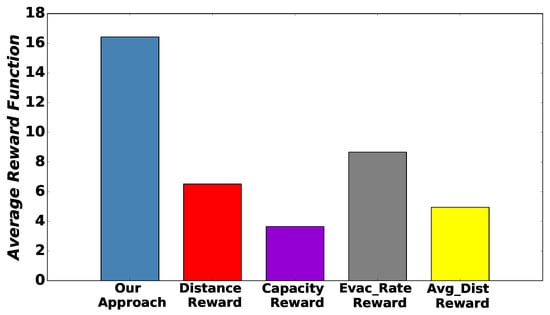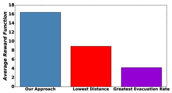 Figure 6 presents the average reward function of all aforementioned approaches. It is observed that our approach presents the best performance (highest average reward function) because it examines and properly combines several features of the other approaches, including capacity C e , evacuation rate λ e , and distances of evacuees from evacuation routes d m , e , m e . Moreover, we notice that the “Capacity Reward” approach had the worst performance as it took into consideration only capacity C e , which is a static feature and common for all evacuees. Among the remaining methods, the one with the evacuation rate as a reward function (“Evac_Rate Reward”) is the best because its nature is dynamic, and it is constantly updated during the algorithm, implicitly indicating the evacuees how congested evacuation routes are. Finally, approaches that consider evacuee distances from the evacuation routes (i.e., “Distance Reward” and “Avg_Dist Reward”), given that distances are different for each evacuee, achieved a better distribution of the evacuees to the evacuation routes when compared to the “Capacity Reward” alternative.