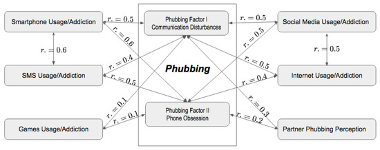 First, we expect phubbing to be positively related with phone-related addiction (e.g., use of Short Message Service, SMS) and with Internet and social media addiction [11,12]. Indeed, in the first case, the phone is a medium through which addiction is substantiated, while surfing on the Internet and social network attendance could be thought as the objects to which addiction is directed.