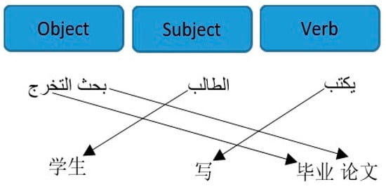 Arabic and Chinese belong to different language families. Arabic is a morphologically rich and complex language with a typical verb–subject–object (VSO) order. Although VSO is the typical word order of Arabic, the corpora used show a mixed distribution of VSO, subject-verb-object (SVO), and verb-object-subject (VOS) clauses (VOS order is admitted in specific contexts, for instance using a pronoun to express the object). By contrast, Chinese lacks morphology and exhibits a systematic word order of SVO. Word order in Chinese is considerably closer to that in English compared with that in Arabic. Figure 1 shows an example of Arabic typical order and Chinese order.