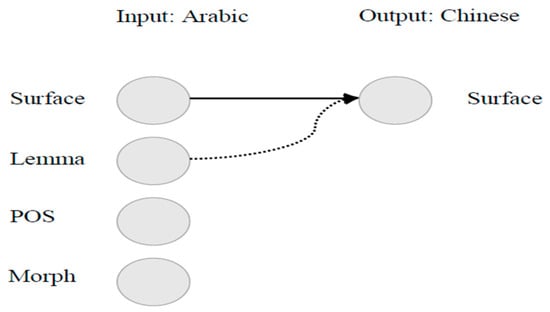 Although these factors do not have particular meanings within the model, they enrich the translation model with general representations to overcome the problems of data sparseness in limited training data. Moreover, these factors allow the direct modeling of many translation aspects, such as morphological, semantic, and syntactic levels []. For instance, words with the same lemmas allow their inflectional variants to share better representation in the model, which helps reduce the data sparseness problems. The POS tags are also beneficial for disambiguation.