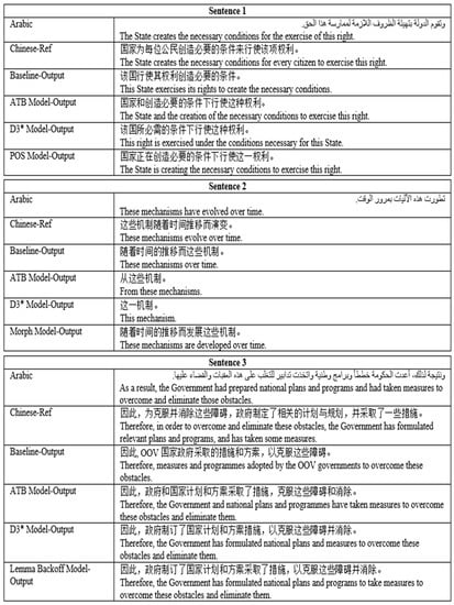 Since that Chinese doesn’t have the definite article “the”; removing the definite article by the D3* model makes Arabic as a source language more similar to Chinese as a target language that improves the alignment and decreases the OOV rates which, likewise, gains a better performance. As in the examples of Figure 5, where removing “the” from the words “the state, the necessary” in sentence 1 and “the government” in sentence 3 enhanced the translation performance of D3* model.