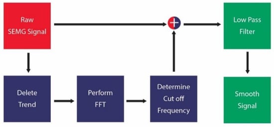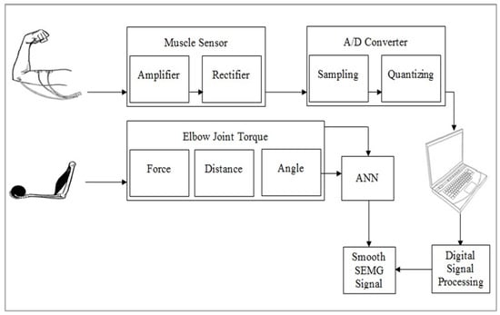 A full description for the modeling design and implementation is shown in Figure 1. The modeling design starts with collection of the SEMG signal (electrical activity) from the bicep muscle by electrodes. After converting to a digital signal, we extract a smooth signal by removing noise by converting the SEMG signal from the time domain to the frequency domain by FFT to calculate the cutoff frequency and apply a digital filter []. We have experimentally determined this cutoff frequency after converting the SEMG signal to the frequency domain using the Fast Fourier Transform (FFT). We set the cutoff frequency to be 10 KHz.