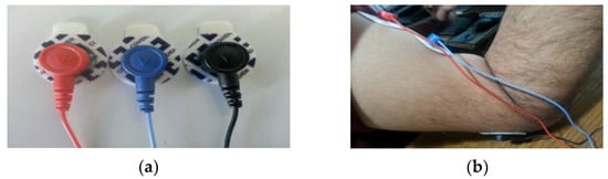 The data is collected from the bicep muscle in the right arm via three electrodes applied to human skin. They are used to capture the electrical activity during the dynamic contraction of the bicep muscle, which is the SEMG voltage signal as shown in Figure 2a. Two electrodes are effectively used to collect SEMG signal. The third electrode served as a reference (sometimes called ground electrode) []. Collecting high quality SEMG signals depend on (i) proper skin preparation and (ii) the position of the electrodes. Proper skin preparation is vitally important to collect high quality SEMG signals with minimal noise. The first stage involves removing the hair from the skin where the electrode will be placed. To ensure a good contact with the skin with low impedance the second stage involves cleaning the skin with alcohol. Surface electrodes are attached to the bicep muscle as shown in Figure 2b.