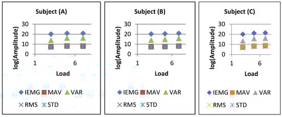 The time domain features analyze the relationship between the amplitude of the SEMG signal and load during the contraction of the bicep muscle. The SEMG signals were collected in the time domain with three various loads and three subjects in order to estimate the relationship between amplitude of the SEMG signal and the load. The smoothed signals for three subjects with 3 kg, 5 kg and 7 kg load go into the feature extraction process. The statistical features were selected IEMG, MAV, VAR, STD and RMS. The average value of five-time domain features is shown in Table 2. We can observe the values of the feature in the time domain for the SEMG signal changes according to the change of each load. That means when the load increases, the value of the feature in the time domain for the SEMG signal also increases, or in other words, the subject consumed more force when lifting his right hand with increasing load. As can be observed in Figure 13, the relationship of the five-time domain features was done as logarithm amplitude for the three subjects with three loads.