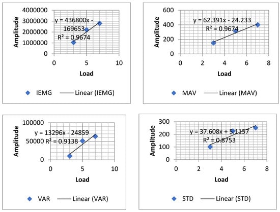 In Yahya et al. [], the authors have extracted several features of temporal EMG signals during hand-lifting of several loads. The authors suggested that interpreting EMG signals in time domain through feature extraction is better than studying those signals in frequency domain. In that regard, a set of four different features have been extracted. Those are: IEMG, MAV, VAR and RMS. The average muscle force condition is calculated based on the EMG signal peak amplitude and the full-wave rectification method. The R2 value is used to depict the correlation between the EMG signal amplitude with the muscle load. The extracted IEMG feature is chosen as a reference feature for estimating of muscle force with R-squared value of 0.997.