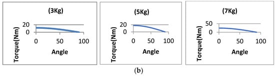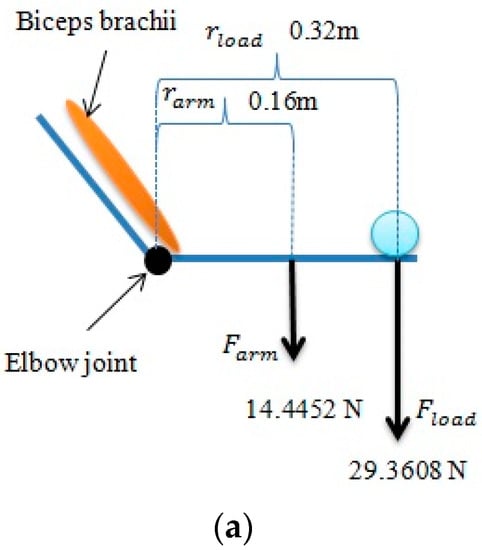 As can be observed in Figure 15a, the resistance forces are   and , and distance from elbow joint  and . Figure 15b shows the result of the torque for Subject C with three loads.