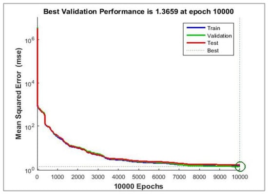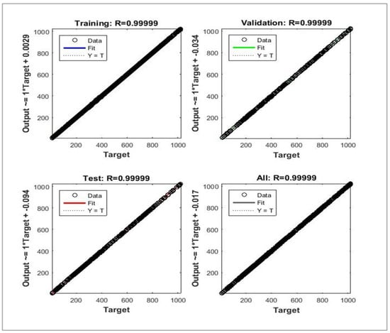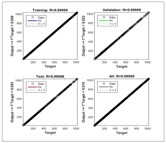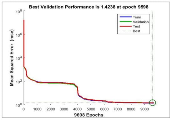 The artificial neural network (ANN) is a nonlinear model used in this research to model the SEMG signal with three loads 3 kg, 5 kg and 7 kg, since the SEMG signal is nonlinear. A multilayer perceptron (MLP) is a feed forward neural network consists of multiple layers with back-propagation algorithm technique to minimize the errors and supervised learning [,,]. This research designed the ANN with MATLAB R2015a, and has chosen MLP with a Lavenberg–Marquardt training back-propagation algorithm, which can be used to enhance different area of research as in [,,]. Several designs were tested in this research to choose the good neural network design, with the number of neurons from 10 to 60 in steps of 10. The neural network was trained on the data size of 7000 samples by dividing the data into three sets (i.e., 70% for training, 15% for validation and 15% for testing).