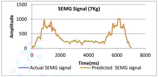 In Darmakusuma et al. [], the authors utilized the MAV method to estimate bicep force based on a collected set of surface electromyography (SEMG) signals. For that, different loads have been applied on the targeted muscle. Those are: zero, 2 kg, 3 kg, 4 kg and 5 kg. Noise in SEMG signals was reduced by having them pass through a Butterworth band-pass filter (BPF) with low and high cutoff frequencies of 10 Hz and 40 Hz, respectively. The authors used the mean absolute value (MAV) method to estimate the average muscle’s force based on the SEMG voltage amplitude. The ultimate goal was to represent three states of arm muscles; (i) arm in rest, (ii) lifted arm without load and (iii) lifted arm with load.