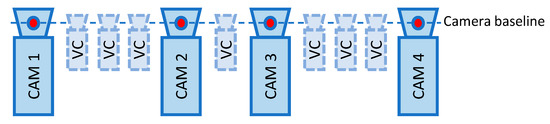 Camera and potential rendering positions in a typical include 3DTV or FTV application (CAM (real camera) and VC (desired virtual camera/view locations), which may be requested at the receiver end by the viewer).