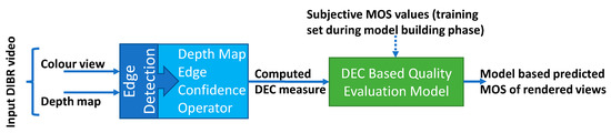 This section presents the methods used to develop our proposed no-reference depth map quality evaluation model aimed to provide an accurate estimation of the quality of rendered (virtual) views in immersive multi-view video content. The section first elaborates on the proposed model development in two steps. First, edge detection is performed on the input DIBR views, leading to a new depth map edge confidence measure computation. This is then followed by building a model based subjective quality prediction mechanism. All of these constitute the core of the proposed no-reference depth map quality evaluation model presented in this work, as illustrated in Figure 2. Subsequently, the dataset and test methods employed in the evaluations are presented in the section.