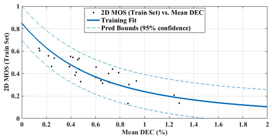 Several mathematical models were examined by performing the curve-fitting process to identify the best matching mathematical relation between the 2D MOS results with the equivalent mean DEC measurement values. The results were classified in terms of correlation coefficient (CC), and root mean square error (RMSE) values. The curve-fitting operation was performed with the prediction bounds set within a 95% confidence interval. From the several curve-fitting steps tested, the top-performing equation was selected for constructing the DEC measurement-based model, and the constant parameters of the model were tuned to produce the maximum correlation for the training set. The resulting graph for the selected model obtained from the curve-fitting process is depicted in Figure 5.