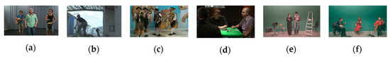 Sample thumbnails of the colour views extracted from the six test sequences: (a) Band; (b) BMX; (c) Musicians; (d) Poker; (e) Act; (f) Parisband.