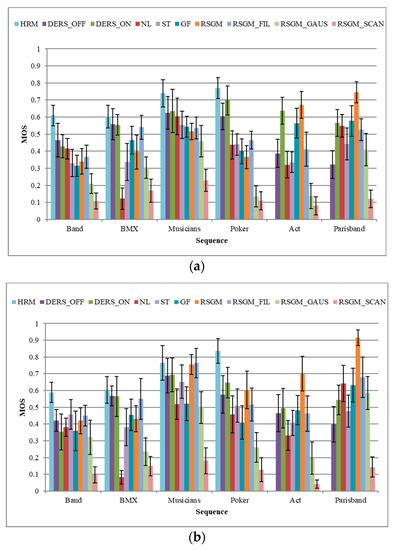 Subjective depth map quality assessment results across a range of depth maps used in DIBR based view rendering: (a) 2D video; (b) 3D video (HRM; DERS_OFF/ON: MPEG depth estimation reference software (DERS) temporal enhancement feature off/on [41,42]; NL: Non-Local method [8]; ST; GF: Guided Filter method [43]; RSGM; RSGM_FIL; RSGM_GAUS: Gaussian blur introduced to RSGM_FIL; RSGM_SCAN: Scan-line error introduced to RSGM_FIL).