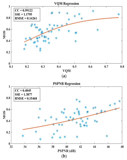 Correlation of 2D objective quality evaluation and subjective assessment results: (a) VQM regression results; (b) PSPNR regression results.