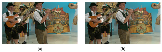Visual comparison between the rendered views of the Musicians sequence: (a) View rendered utilising RSGM_GAUS depth map; (b) view rendered utilising RSGM_SCAN depth map.