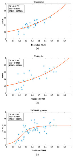MOS logistic regression results: (a) 2D training set results; (b) 2D testing set results; (c) 3D MOS logistic regression results.
