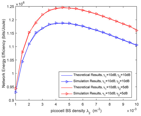 Figure 2 shows the impact of picocell BS density on EE. It can be seen that the simulation results are in line with the theoretical results, which validates the correctness of EE expression in Equation (13). We can see that if the MUE density, the macrocell BS density, and the power consumption of BS are given, there must exist an optimal picocell BS density that can maximize EE. It can be seen that the EE increases first and then decreases with the increase of the density of the picocell BS. The reason for the increase is that with the increase of the density of the picocell BS, since the distance from the picocell BS to the MUE is obviously smaller than that from the macrocell BS to MUE, more users will access the picocell BS. Additionally, the power consumption of the picocell BS is small, so EE will be improved at this time. However, when the density of the picocell BS is greater than a given value, the number of access users will be saturated, while a continuous increase of the density of the picocell BS will lead to an increase of power consumption, meaning the EE will gradually decrease.