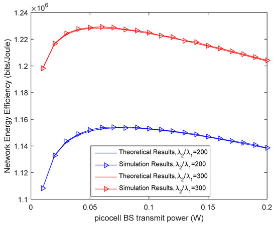 Figure 3 gives the average EE against the transmit power of picocell BSs. Figure 3 shows the impact of picocell BS transmit power on EE. The target SIR for the macrocell BSs and picocell BSs are set to 10 dB and 5 dB, respectively. It can be seen that the EE increases first and then decreases with the increase of the transmission power of the picocell BS. The reason for the increase is that with the increase of the transmission power of the picocell BS, since the SIR threshold of the micro-base station is low, increasingly more users will access the micro-base-station, while because the power of the picocell BS is small, EE will be improved at this time. However, when the transmission power of the picocell BS is greater than a given value, the number of access users will be saturated, and the continuous increase of the transmission power of the picocell BS will not lead to the increase of network throughput, so the EE will gradually decrease. It can also be seen that the simulation results are in line with the theoretical results. In addition, we can conclude that if λ u , λ 1 , λ 2 , and P T 1 are given, we can find an optimal P T 2 that maximize EE.