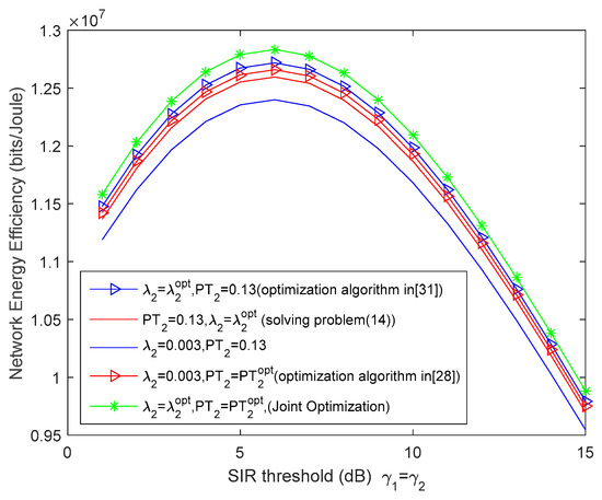 From Figure 4 we can see that with the increase of target SIR, the network EE curve rises first and then drops. This is because the achievable data rate of the tagged MUE increases as γ 1 grows, while the coverage probability decreases as target SIR increases. According to the optimization method given in Section 4.1, we calculate that λ 2 o p t = 4.4 × 1 0 3   m 2 . It can be seen that the optimal solution λ 2 o p t is in agreement with the simulation results shown in Figure 2. According to the optimization method given in Section 4.2, which is also the optimization method proposed in [28], it can be calculated that P T 2 o p t = 1.9 × 1 0 2   W . According to the proposed joint optimization algorithm, it can be calculated that the optimal pair is ( P T 2 o p t = 2.9 × 10 2 W , λ 2 o p t = 3.8 × 10 3 m 2 ) . We also compare the proposed joint optimization scheme with the optimization algorithms proposed in [31], as well as the schemes for fixed power and density. The proposed joint optimization scheme can obviously improve network EE. Therefore, in HCNs, BS density and transmit power should be carefully designed. Otherwise, arbitrarily designed density or transmit power will decrease the network EE.