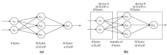 Figure 1b shows the same dataflow graph partitioned for distributed execution on two fictional devices: device A, which can perform 18 FLOP/second (FLOP/s) and provide 20 B of memory and device B, which can perform 18 FLOP/s and provide 52 B of memory. Additionally, the communication link between these devices can transfer 4 B per second. The amount of transferred data per inference in this partitioning is 8 B because, although six edges are crossing the partitions, they represent the data transfer of only 8 B.