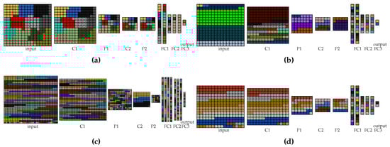 CNNs are composed of convolution layers, pooling layers, and fully connected layers []. The pooling layers transform the high-resolution input data into a coarser resolution and also make the input invariant to translations. At the neural network end, a fully connected layer indeed classifies the input. CNNs arrange the neurons of each layer in three dimensions: height, width, and depth.