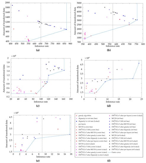 In Figure 7a, for the two-device experiments, the Pareto curve contains two points, which correspond to the free-input DNPCIoT after METIS for the inference rate maximization and most of the locked-input DNPCIoT after approaches for communication reduction. The only approach that falls within the southeast quadrant is the free-input DNPCIoT after METIS for the inference rate maximization, which is the best trade-off between the inference rate and the amount of transferred data for this setup. Although several points fell within the southeast quadrant, it is worth noting that the three points that are closest to this best trade-off all correspond to the free-input DNPCIoT for the inference rate maximization, showing the robustness of DNPCIoT.