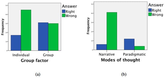 Both the factors show a significant effect on the criterion, as indicated in Figure 1a,b, with the higher effect appearing to be played by the strategy of reasoning factor (χ2 = 22.653, p < 0.01), with the group factor explaining a smaller portion of variance (χ2 = 9.189, p < 0.01). The subsequent analysis investigated the relation between the experimental conditions and the adopted strategy of reasoning. Of course, the sample used to assess such strategies, which is a property measurable only with the open format of response, was composed by the half of the sample (60ss).
