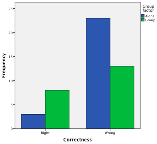 Once the principal effects were assessed, we moved toward a multivariate analysis to investigate the combined and complex effects due to factors interaction on the correctness of the answer. In order to estimate both the principal as well as the combined effects of the experimental factors, we adopted a multiple linear regression modeling. In this analysis only, half of the samples has been considered (n = 60) to estimate the relevance of the control parameters strategy of reasoning (that can be assessed only in the open-ended format of answer). As a consequence, within such a model we had just two factors (i.e., group condition and strategies of reasoning). In Table 3 is reported the best multiple logistic model parameters. It should be noted that that negative coefficients refer to wrong answers and positive to correct answers. Results show how the model is able to address the 58.1% of the variance (Nagelkerke = 0.581), suggesting the relevance of the strategy of reasoning factor (Wald = 12.230) with respect to the group factor (Wald = 6.675). Even in this case no combined effect linking the two model factors emerged from the analysis, in other words the factors considered by the model do not present a significant relation and appear to not interact in affecting the dependent variable.