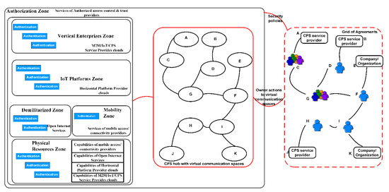 The right side of the Figure 2 represent an example view of the relationships between owners of physical CPS resources (devices). An owner can be an individual person, a group of people, or an organization, who may have agreements between each other. For example, person D has an agreement with CPS service provider B and with the group of people G, which can be, for example, family of person D. The natural needs of each owner are to control the access, usage of his/her/is own the physical CPS resources (devices), and the exposed information. Today, there are multiple vertical CPS SPs providing services for the owners; however, there is no proper means for the owners to referred control process. The CPS hub has been developed to enable the referred control process for the owners. In the CPS hub solution, each owner is expected to have their own communication space, representing the owner in a virtual world. The communication space acts on behalf of the owner to link and represent the services, networks, contents, and physical CP resources (devices) of the owner in the virtual world. The security policies of the owner are used to define the rules for the access, usage of the resource, and exposed information. The referred security policies of a specific owner are inherently the same for all the stakeholders in all the zones; therefore, the horizontal services of authorization and trust zone are envisioned to be useful for all stakeholders in the CPS value chains.