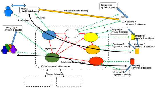 An example of the logical structure of a CPS communication hub is depicted in Figure 3. Each owner has a virtual communication space, represented as a colored oval in the dashed rounded rectangle in the middle of Figure 3. The dashed green lines represent the related ownership relations, for example, person X owns the blue virtual communication space. The physical CPS resources (e.g., devices, server) of a specific owner register their presence in the communication space (green lines). For example, the devices and server of company A can register in the white communication space. The red lines connecting virtual communication spaces represent agreements between the owners. The referred agreements are negotiated online between the resources of the owners via the communication spaces. The blue, black, and orange lines represent the example information flows. The main operation processes related to the referred information flows are presence management of the physical CPS resources (green lines), information sharing (black lines), and data plane operation (orange line). The operation of physical CPS resources and trust checking with CPS communication spaces represent the key enablers of the CPS hub, which are described in the following sections.