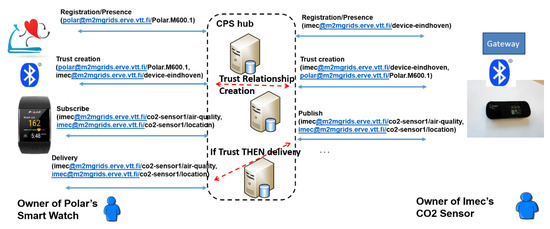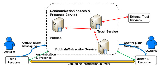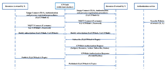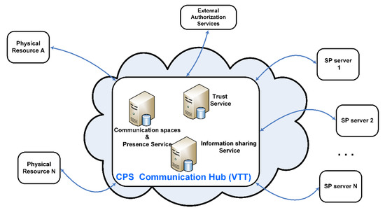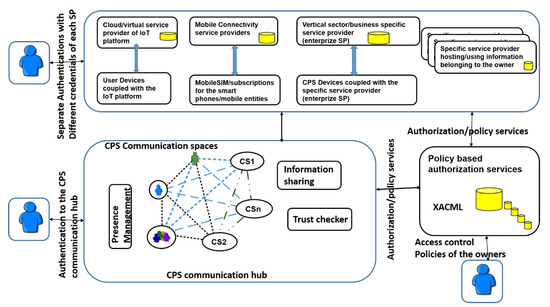 Each stakeholder needs to be authenticated with separate credentials to the CPS communication hub, and have a specific virtual communication space there. In addition, each stakeholder needs to describe their own security policies in the policy based authorization framework relying on, for example, XACM [22,23,24,25]. These security policies can then be applied by the SPs via authorization policy services, which enables consideration of the requirements of the owners. The authorization policy services need to be reliable and common for all the SPs, including CPS communication hub, in order to achieve smart cross domain/SP services for users/owners. The CPS communication hub takes care of the presence management, establishment and maintenance of the communication spaces with their trustworthy relationships, and information sharing with trust checking. The role of the trust checker is to ensure that the required information subscription is in line with the current relationship of the stakeholders and their authorized policies. The required information delivery can happen only if both the relationships and policies allow it.