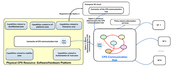 The operation of physical CPS entities with CPS communication spaces has two options; Figure 5. A physical CPS entity can be attached to the CPS communication hub directly (option 1) or indirectly via the enterprise SP cloud (option 2). The direct attachment requires that the physical CPS entity can be programmed to contain the connector of the CPS communication hub with information of the owner of the device, address of the hosting CPS hub and required owner credentials for authentication with CPS hub. Let us assume that we classify the devices based on who chooses the set of tasks embedded in the device—the manufacturer (Class I), the service provider (Class II), or the user (Class III) [26]. When applying this classification, the direct attachment option looks most relevant for Class III devices or devices operating via the Class III gateway.