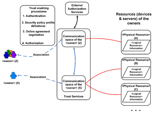 The security policies (profiles) of the owners related to the access, use of their physical and logical resources, and the exposed information need to be defined by the owner. The policy definitions may include, for example, rules according to which the access to the resources of the owner may be allowed for the other parties. Such rules may include conditions related to, for example, situation, time, environment, and level of trustworthiness, among others.